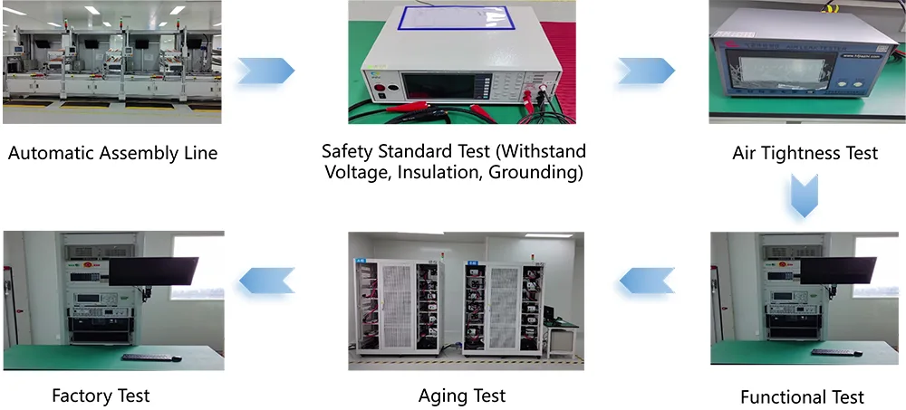 IEC60529 மற்றும் GB/T 30038 தரநிலைகளுக்கு இணங்க, 1.2KW மல்டி-சீன் ஹை-எஃபிசியன்சி ஃபாஸ்ட் சார்ஜிங் OBC CE, FCC, RoHS மற்றும் பிற சர்வதேச சான்றிதழ்களில் தேர்ச்சி பெற்றுள்ளது. எங்கள் தொழிற்சாலையில் மேம்பட்ட உற்பத்திக் கோடுகள் மற்றும் கடுமையான தரக் கட்டுப்பாட்டு அமைப்பு உள்ளது, மூலப்பொருள் ஆய்வு முதல் முடிக்கப்பட்ட தயாரிப்பு சோதனை வரை, 100% தயாரிப்பு தகுதி விகிதத்தை உறுதிப்படுத்த 16 ஆய்வு நடைமுறைகள் மேற்கொள்ளப்படுகின்றன. ஒவ்வொரு தொகுதி தயாரிப்புகளுக்கும் நாங்கள் தொழில்முறை தர ஆய்வு அறிக்கைகளை வழங்குகிறோம், மேலும் உற்பத்தி செயல்முறை திறந்த மற்றும் வெளிப்படையானது, வாடிக்கையாளர் ஆன்-சைட் ஆய்வை ஏற்றுக்கொள்கிறது.