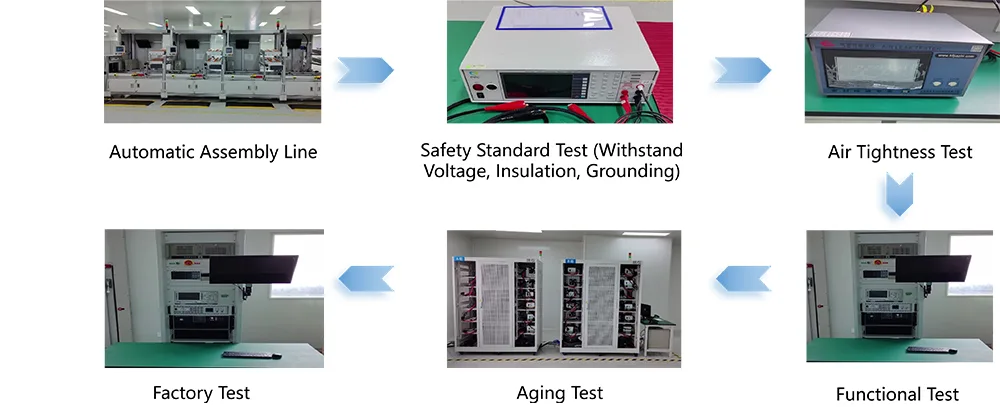CCC (சீனா கட்டாயச் சான்றிதழ்), CE (ஐரோப்பிய ஒன்றியம்), UL (அமெரிக்கா) மற்றும் EN50498 உட்பட உள்நாட்டிலும் வெளிநாட்டிலும் இந்த தயாரிப்பு அதிகாரப்பூர்வ சான்றிதழ்களைப் பெற்றுள்ளது. இது NB/T33001-2025 மற்றும் GB31241-2014 தரநிலைகளுடன் இணங்குகிறது, மின் பாதுகாப்பு மற்றும் மின்காந்த இணக்கத்தன்மையை உறுதி செய்கிறது. எங்களிடம் ஒரு நவீன உற்பத்தித் தளம் உள்ளது மற்றும் V0 மதிப்பீடு மற்றும் FR-4 கண்ணாடியிழை PCB போர்டுகளுடன் கூடிய சுடர்-தடுப்பு ABS+PC கலப்புப் பொருள் வீட்டுவசதியை ஏற்றுக்கொள்கிறோம். முக்கிய சாலிடர் மூட்டுகள் அலை சாலிடரிங் தொழில்நுட்பத்தைப் பயன்படுத்தி செயலாக்கப்படுகின்றன மற்றும் 5,000 செருகல்/பிரித்தல் சுழற்சிகள், அதிர்வு எதிர்ப்பு மற்றும் உப்பு தெளிப்பு அரிப்பு எதிர்ப்பு போன்ற கடுமையான சோதனைகளில் தேர்ச்சி பெற்றுள்ளன. ஒவ்வொரு யூனிட்டும் 100% தகுதி விகிதத்தை அடைந்து, தொழிற்சாலையை விட்டு வெளியேறும் முன் 72 மணிநேர முழு-சுமை வயதான சோதனைக்கு உட்படுகிறது. நாங்கள் ஒரு விரிவான தரக் கட்டுப்பாட்டு அமைப்பை நிறுவியுள்ளோம், இது மூலப்பொருள் கொள்முதல் முதல் முடிக்கப்பட்ட தயாரிப்பு விநியோகம் வரை முழுமையான கண்டுபிடிப்பை செயல்படுத்துகிறது.